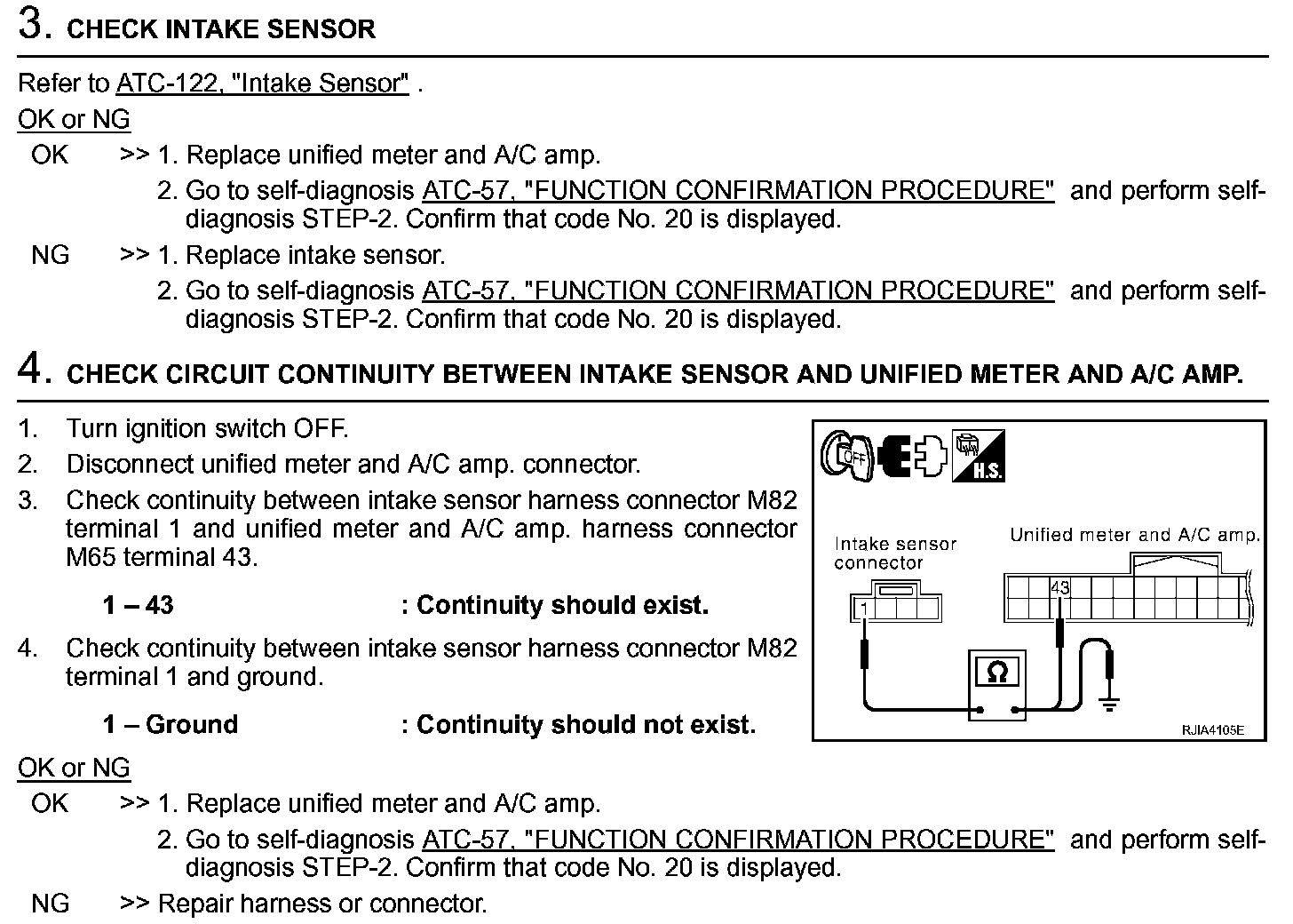 SYMPTOM: Intake sensor circuit is open or shorted. (24 or -24 is indicated on unified meter and A/C amp. as a result of performing self-diagnosis STEP-2.)