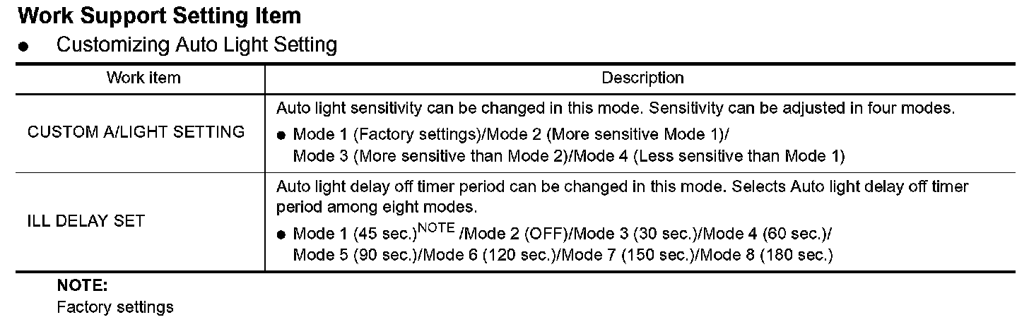3. Touch "CUSTOM A/LIGHT SETTING" or "ILL DELAY SET" on "SELECT WORK ITEM" screen.