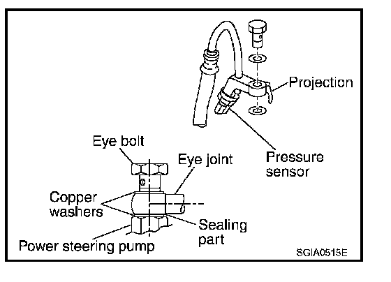 ^ Install eye-bolt with eye-joint (assembled to high-pressure hose) protrusion facing with pump side cutout, and then tighten it to the specified torque after tightening by hand.