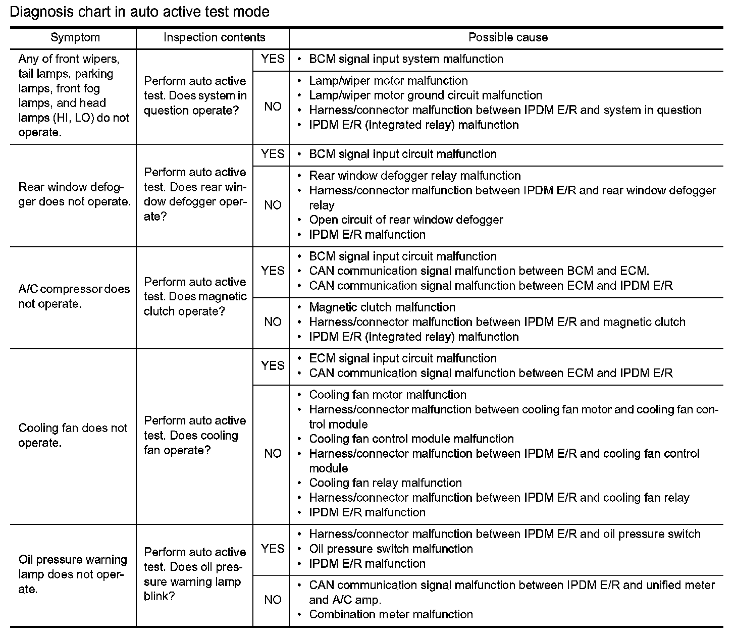 - If any of systems controlled by IPDM E/R cannot be operated, possible cause can be easily diagnosed using auto active test.