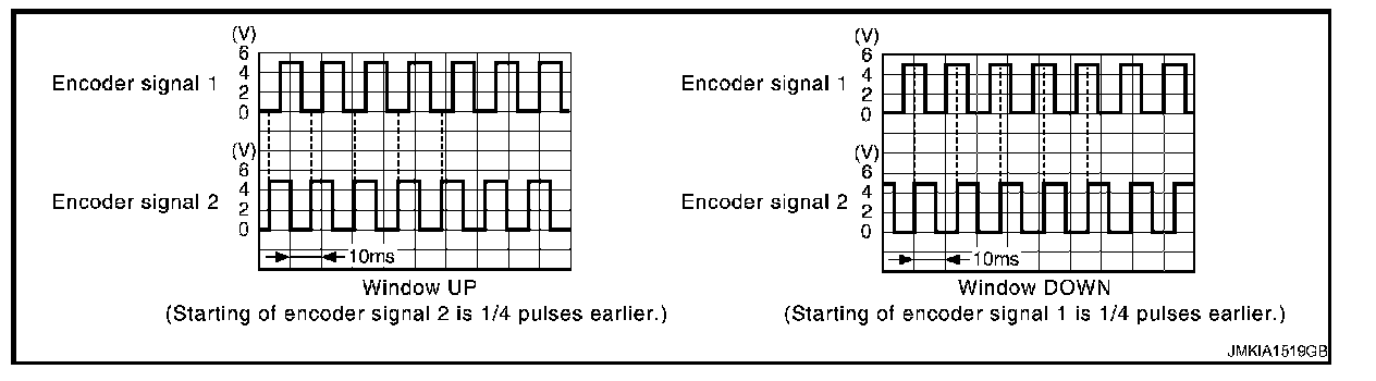 Power window main switch and each power window sub-switch recognizes and controls the door glass condition by reading encoder signals 1 and 2.