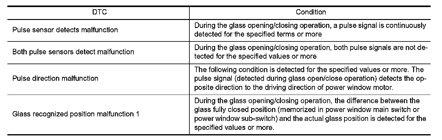 The encoder signal detects the up / down speed / detection of door glass. If the malfunction is detected to the encoder signal or the difference between the glass fully closed position (memorized in power window main switch or power window sub-switch) and the actual glass position is detected, it shifts into the fail-safe control