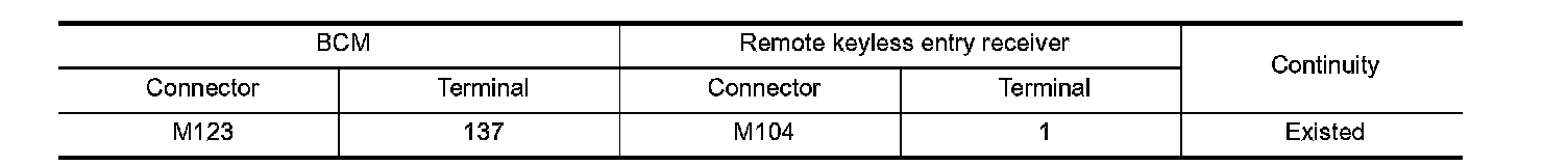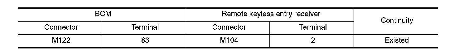 2. Check continuity between BCM harness connector and remote keyless entry receiver harness connector.