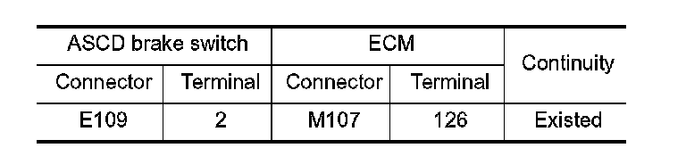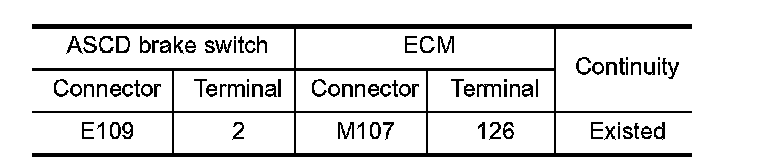 3. Check the continuity between ASCD brake switch harness connector and ECM harness connector.