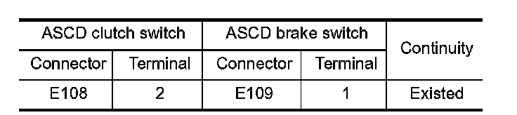 2. Check the continuity between ASCD clutch switch harness connector and ASCD brake switch harness connector.