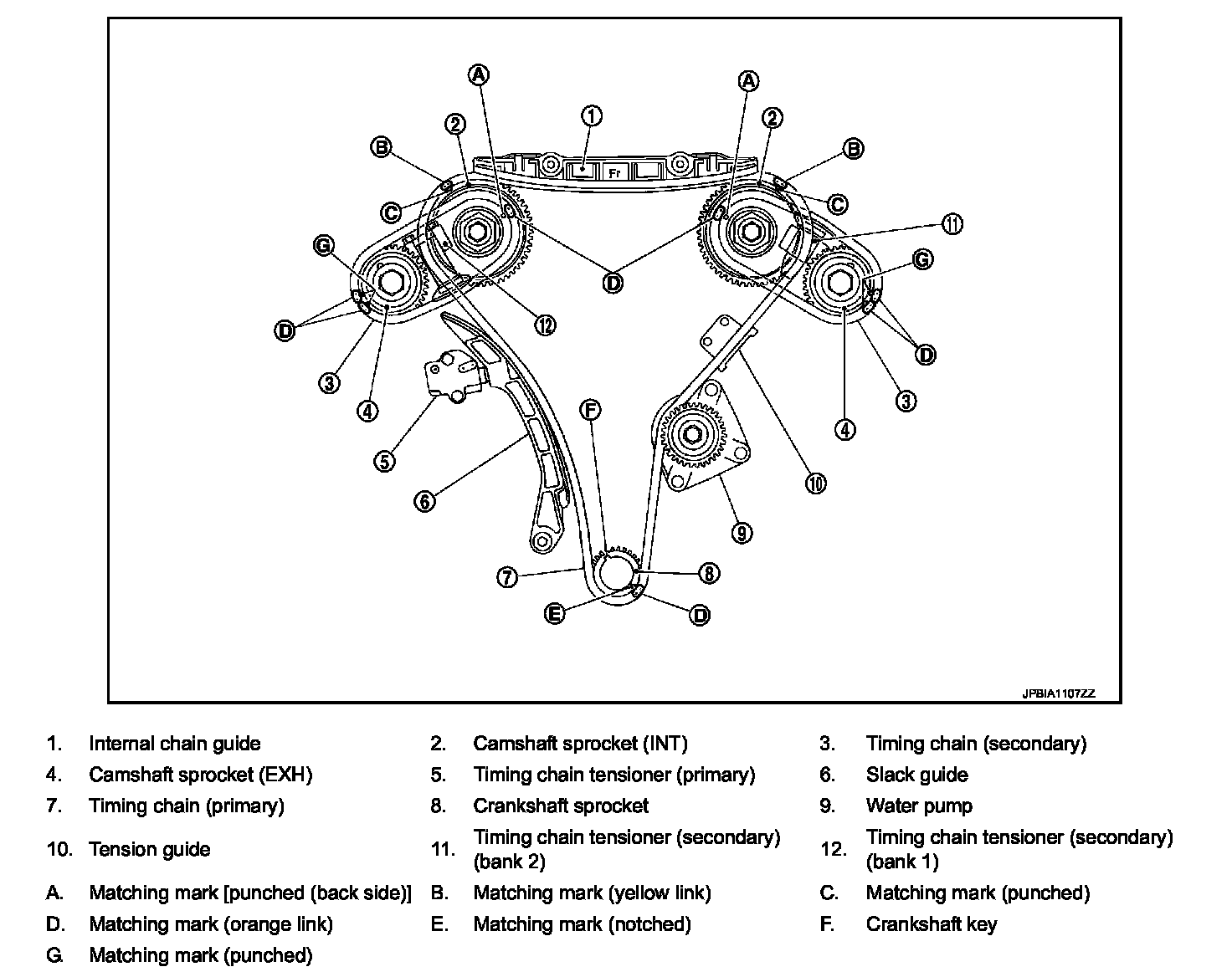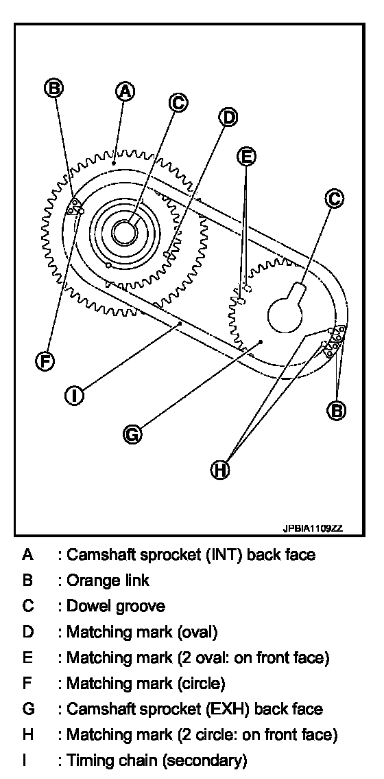 - Matching marks for camshaft sprockets (INT) are on the back side of camshaft sprockets (secondary).