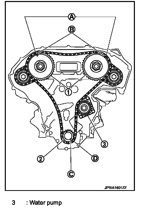 Install timing chain (primary) so that the matching mark (punched) (B) on camshaft sprocket (INT) (1) is aligned with the yellow link (A) on timing chain, while the matching mark (notched) (C) on crankshaft sprocket (2) is aligned with the orange link (D) one on timing chain, as shown in the figure.