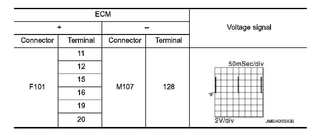 2. Read the voltage signal between ECM harness connector terminals under the following conditions with an oscilloscope.