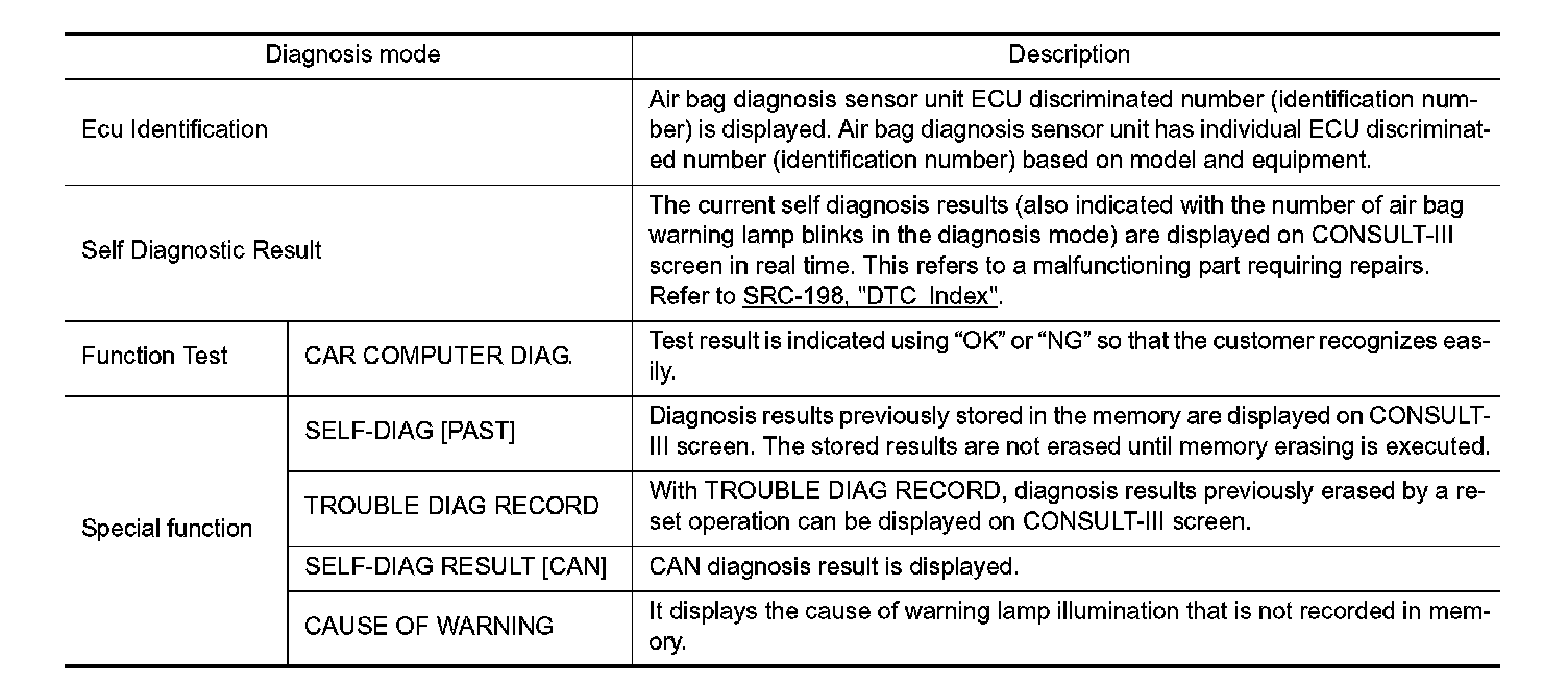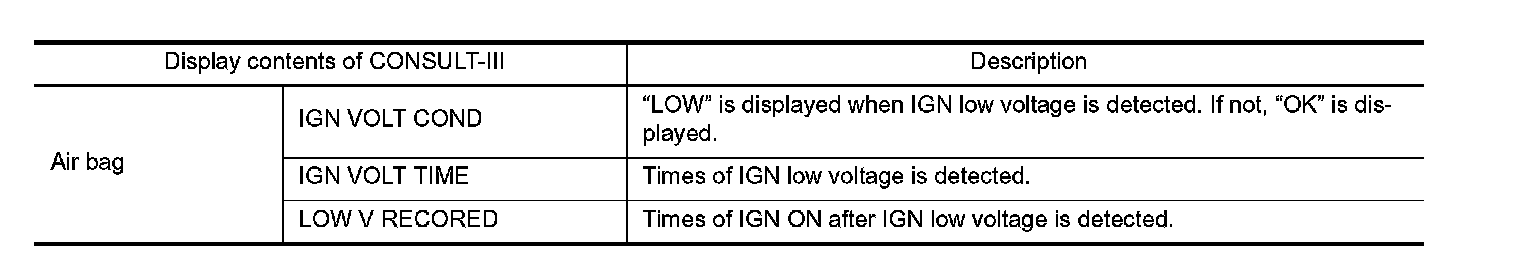 In such a case, the DTC memory is not performed and changing to the self-diagnostic mode by IGN operation cannot be performed while the air bag warning lamp illuminates. "NO DTC" is displayed even if the malfunctioning parts are checked by CONSULT-III.