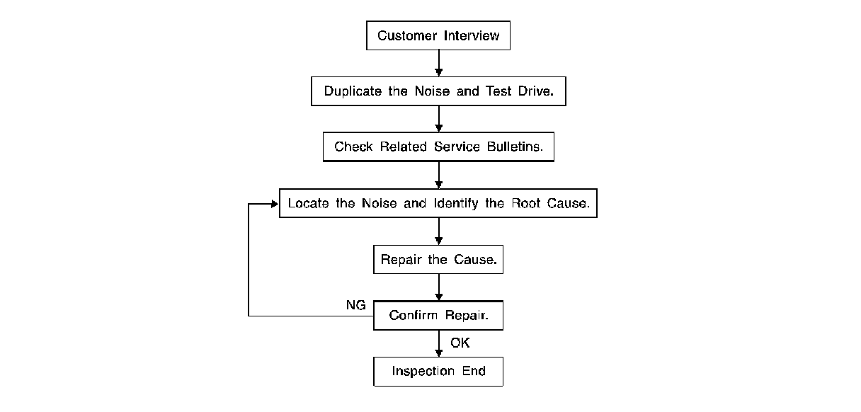 After repair is complete, test drive the vehicle to confirm that the cause of noise is repaired by test driving the vehicle. Operate the vehicle under the same conditions as when the noise originally occurred. Refer to the notes on the Diagnostic Worksheet.