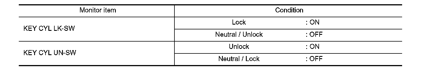 Check ("KEY CYL LK-SW", "KEY CYL UN-SW") in "DATA MONITOR" mode for "POWER DOOR LOCK SYSTEM" with CONSULT-III. Refer to Door Lock.