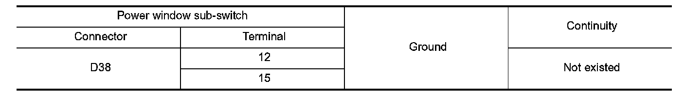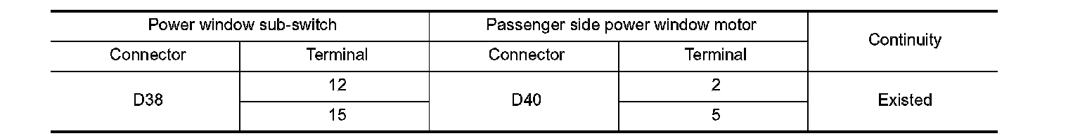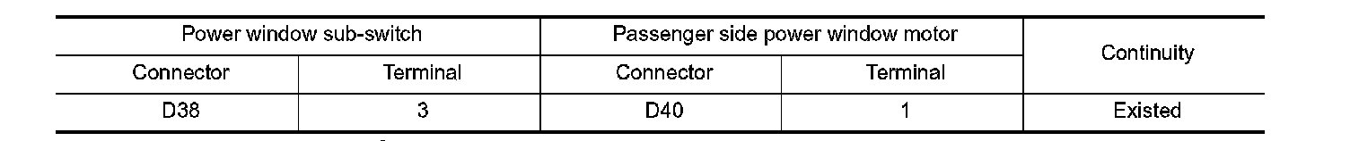 3. Check continuity between power window sub-switch harness connector and passenger side power window motor harness connector.