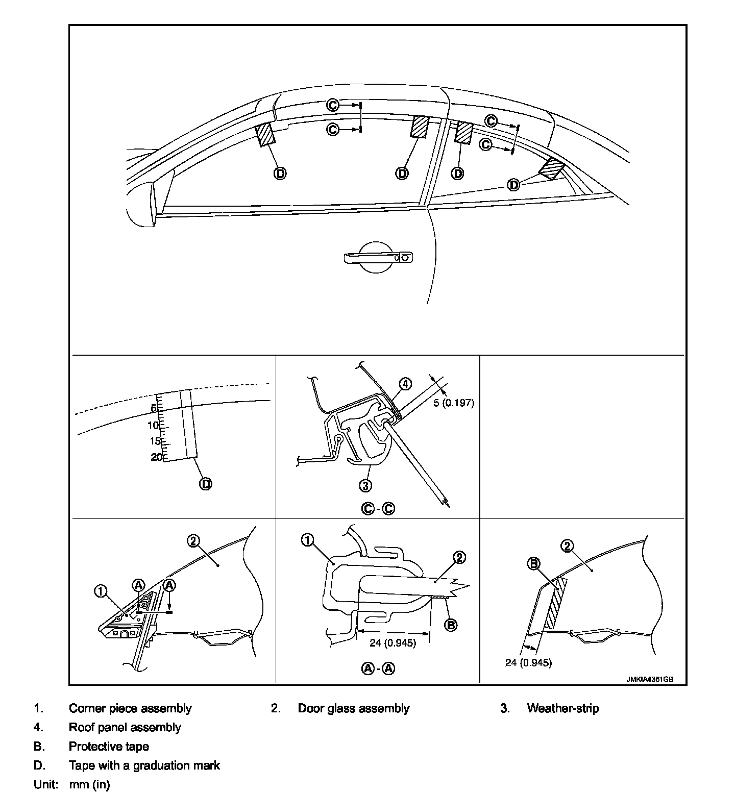 2. Apply a tape with graduation (D) of 20 mm (0.787 in) on glass (door glass and quarter window glass) starting from top edge.