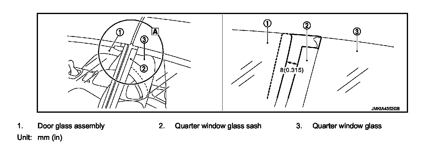 3. Check that the distance between door glass and quarter window glass sash is 8 mm (0.315 in).