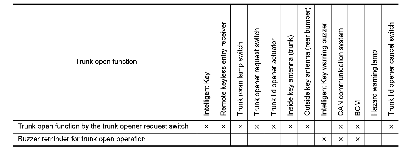 - When BCM receives the trunk open request signal, it operates the trunk lid opener actuator and opens the trunk.