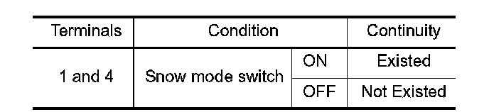 3. Check the continuity between snow mode switch terminals under the following conditions.