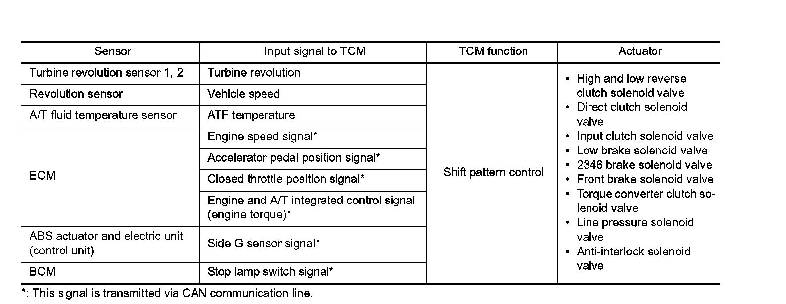 TCM receives the side G sensor signal from the ABS actuator and electric unit (control unit). It locks the gear to the 4th, 5th or 6th position in moderate cornering or to the 3rd position in sharp cornering based on this signal. This prevents any upshift and kickdown during cornering, maintaining smooth vehicle travel.