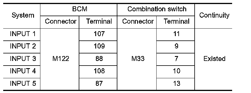 3. Check continuity between BCM harness connector and combination switch harness connector.