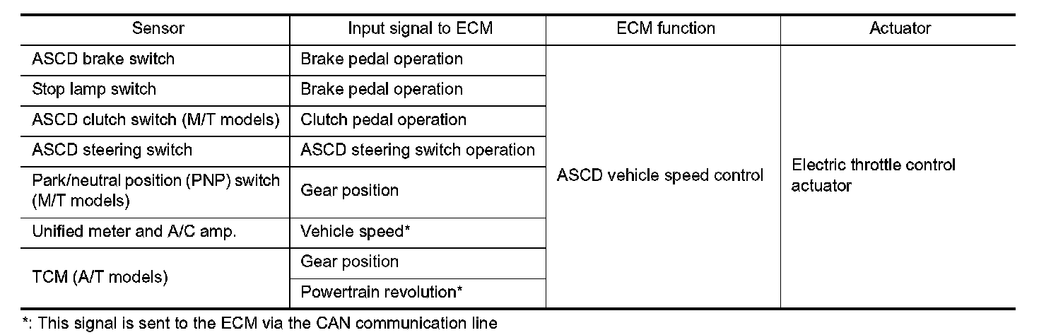 When the ECM detects any of the following conditions, the ECM will cancel the cruise operation and inform the driver by blinking indicator lamp.