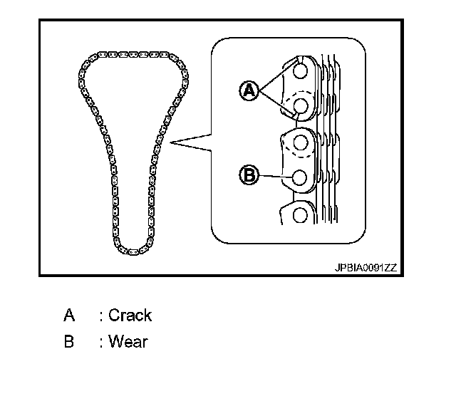 Check for cracks and any excessive wear at link plates and roller links of timing chain. Replace timing chain if necessary.