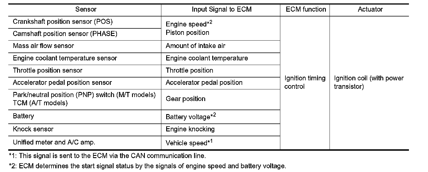 The ECM receives information such as the injection pulse width and camshaft position sensor (PHASE) signal. Computing this information, ignition signals are transmitted to the power transistor.