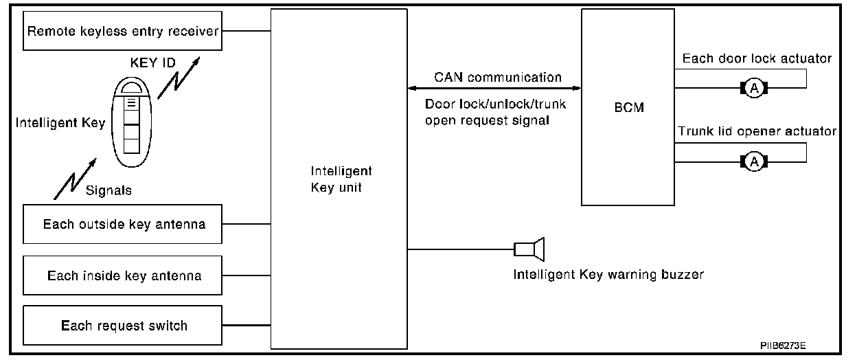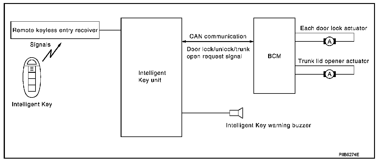 - When door lock/unlock button of the Intelligent Key is pressed, lock signal or unlock signal is sent from Intelligent Key to Intelligent Key unit via remote keyless entry receiver.