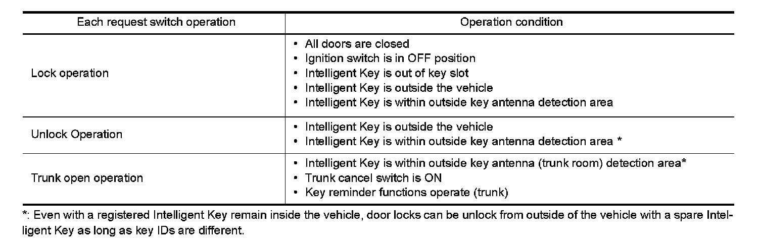 If the following conditions are not satisfied, door lock/unlock or trunk open operations are not performed even if the request switch is operated.