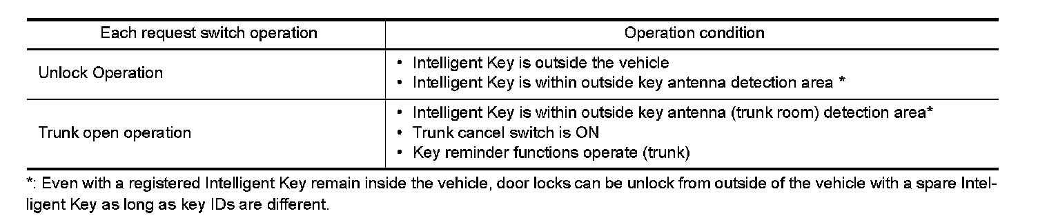 Only when pressing the request switch, it is possible to lock and unlock the door and open the trunk by carrying around the Intelligent Key (without some key operation).