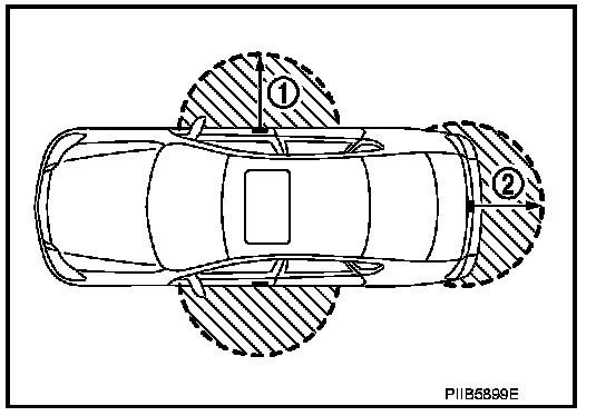 The outside key antenna detection area of door lock/unlock function is in the range of approximately 80 cm (31.50 in) surrounding the driver and passenger door handles (1). The outside key antenna detection area of trunk open function is in the range of approximately