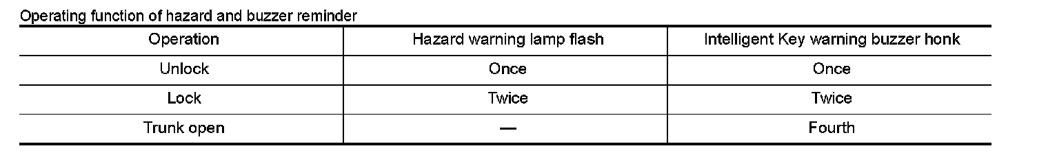During lock, unlock, or trunk opening operation by each request switch, the hazard warning lamps and Intelligent Key warning buzzer will flashes or honk as a reminder.