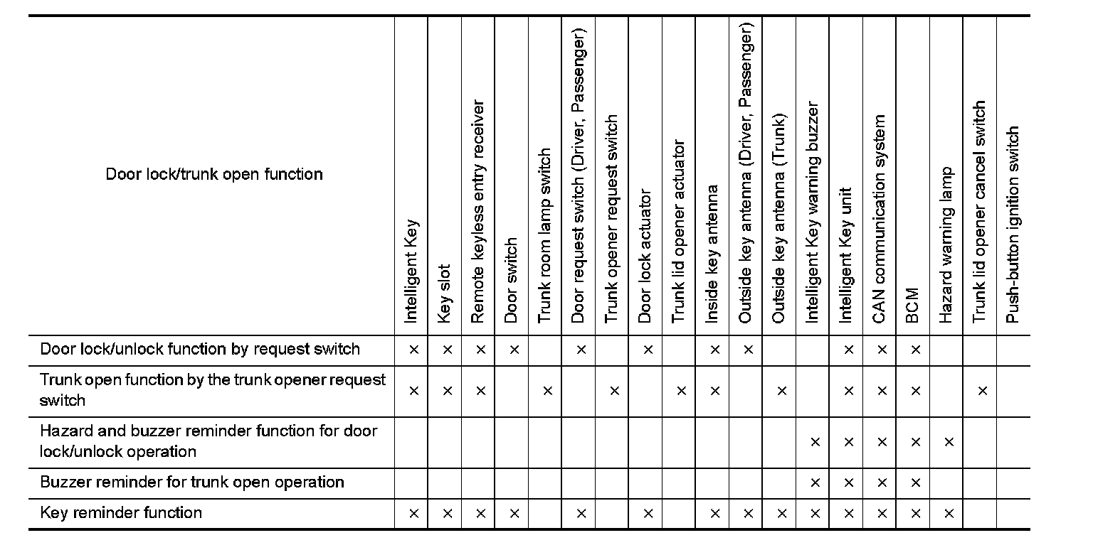 - The Intelligent Key system is a system that makes it possible to lock and unlock the door locks (door lock/unlock function), open the trunk (trunk open function), and start the engine (engine start function) by carrying around the Intelligent Key (without some key operation), which operates based on the results of electronic ID verification using two-way communications between the Intelligent Key and the vehicle (Intelligent Key unit).