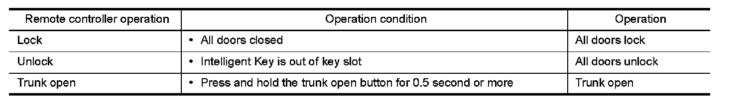 - Operation of the remote controller buttons on the Intelligent Key also provides the same functions as the remote controller entry system. (Remote keyless entry functions)