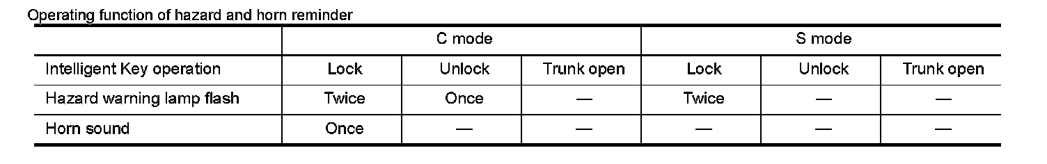 When LOCK and UNLOCK signals are sent from the Intelligent Key for more than 2 seconds at the same time, the hazard and horn reminder mode is changed and hazard warning lamp flashes and horn sounds as follows: