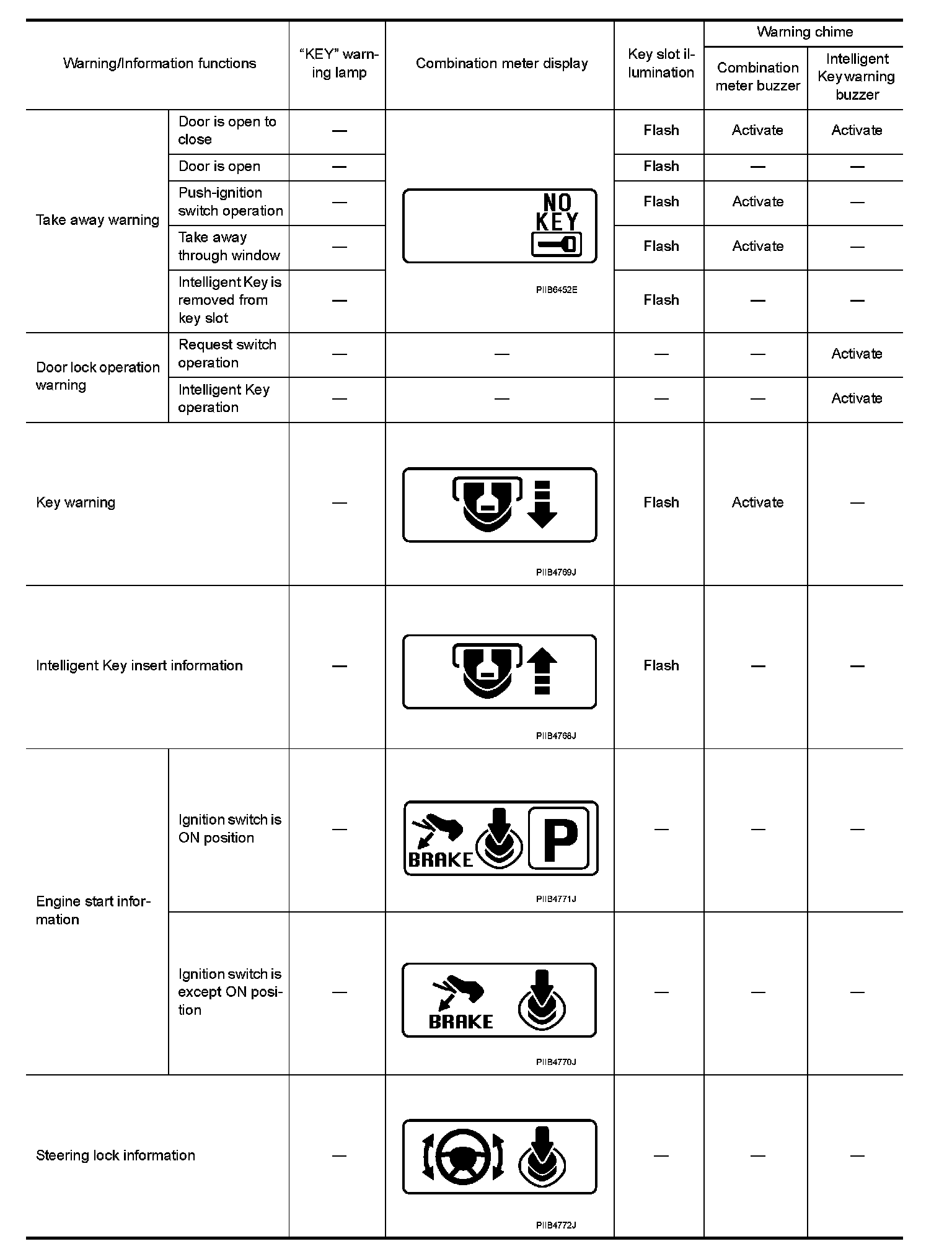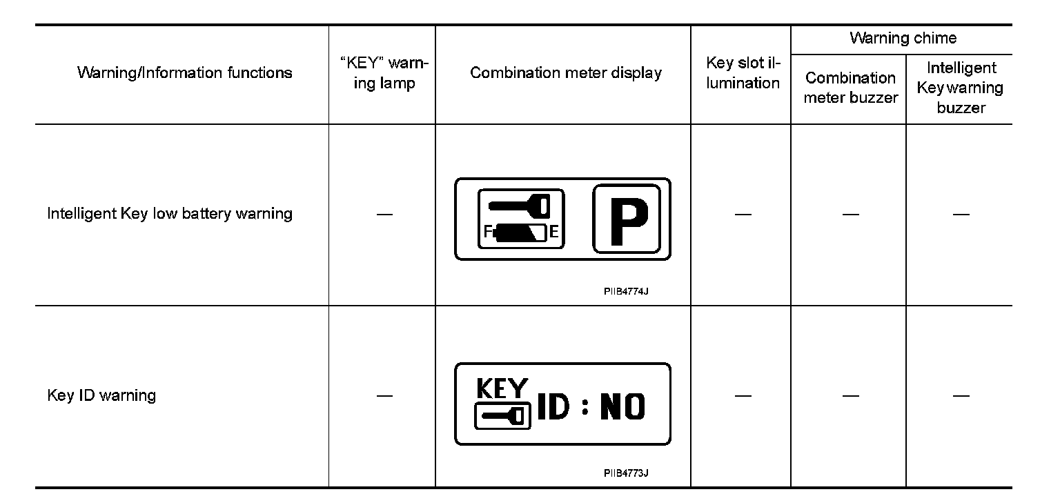 The warning function are as follows and are given to the user as warning information and warnings using combinations of Intelligent Key warning buzzer, KEY warning lamp, key slot illumination and combination meter display in combination meter.