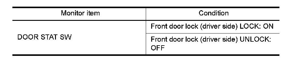 Check unlock sensor ("DOOR STAT SW") in "DATA MONITOR" mode.