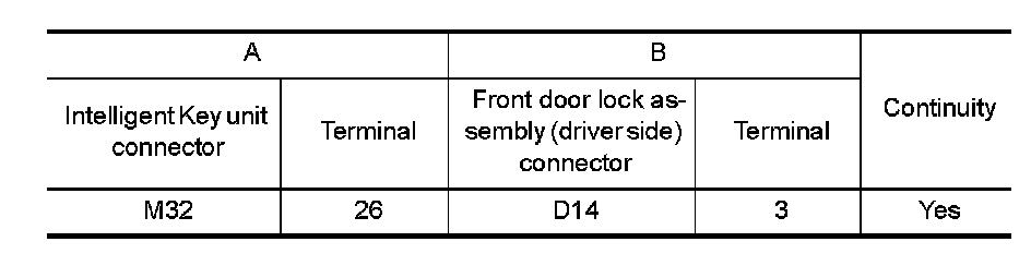 3. Check continuity between Intelligent Key unit connector and front door lock assembly (driver side) connector.