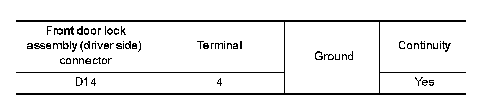 Check continuity between front door lock assembly (driver side) connector and ground.