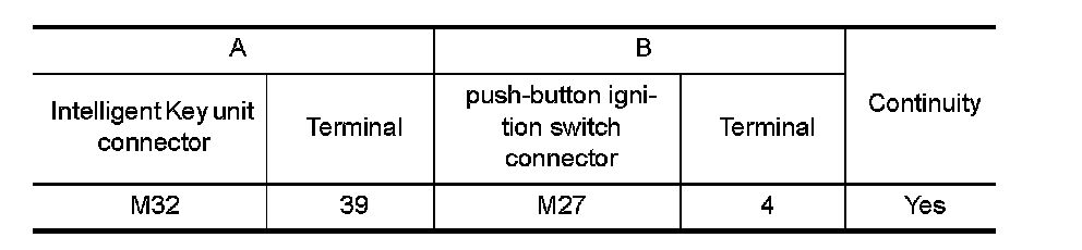 2. Check continuity between Intelligent Key unit connector and push-button ignition switch connector.