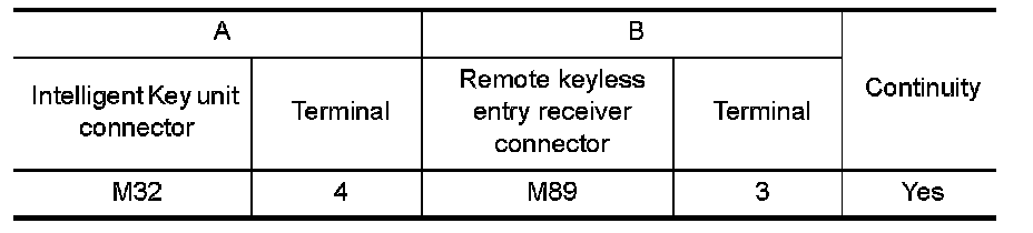 2. Check continuity between Intelligent Key unit connector and remote keyless entry receiver connector.