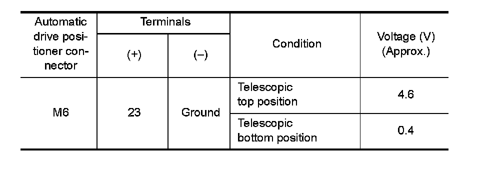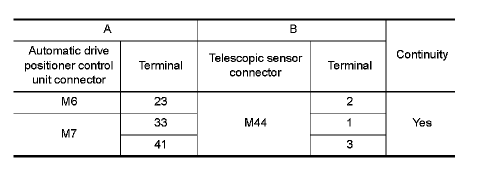 2. Check continuity harness between automatic drive positioner control unit connector and telescopic sensor connector.
