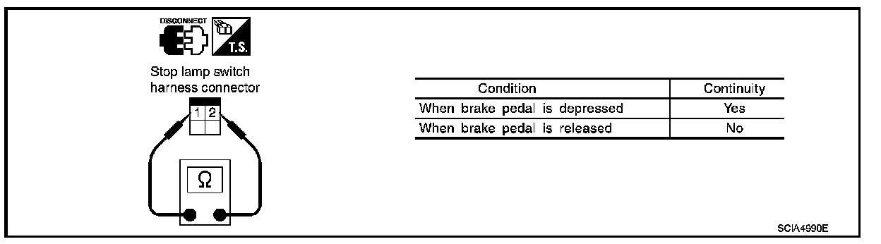 - Check continuity between stop lamp switch harness connector E124 terminals 1 and 2