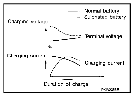 To determine if a battery has been "sulphated", note its voltage and current when charging it. As shown in the figure, less current and higher voltage are observed in the initial stage of charging sulphated batteries.