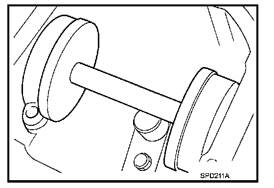 8. Position the side bearing discs, J-25269-4, and arbor firmly into the side bearing bores. Install the bearing caps and tighten bearing cap mounting bolts to the specified torque. Refer to "COMPONENTS".
