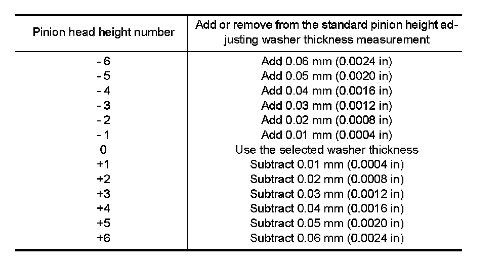 There are two numbers painted on the drive pinion. The first one refers to the drive pinion and drive gear as a matched set. This number should be the same as the number on the drive gear. The second number is the "pinion head height number". It refers to the ideal pinion height from standard for quietest operation. Use the following chart to determine the correct pinion height washer.