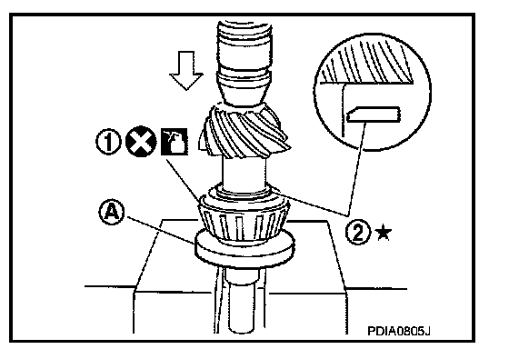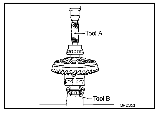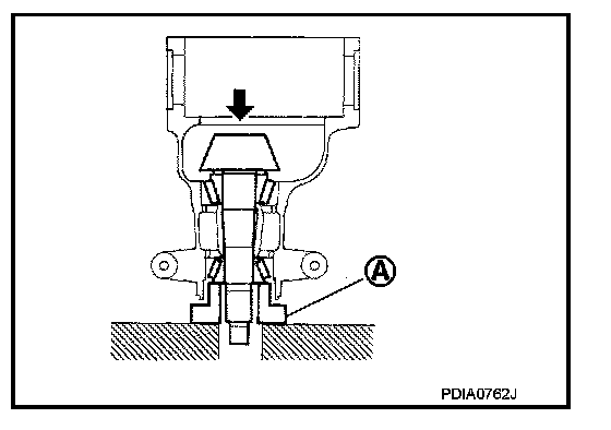 7. Using suitable spacer (A), press the pinion front bearing inner race to drive pinion as far as drive pinion nut can be tightened.