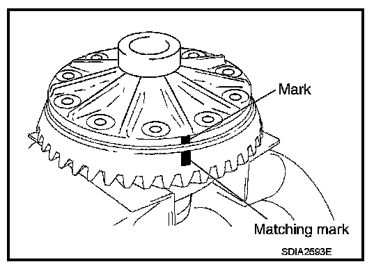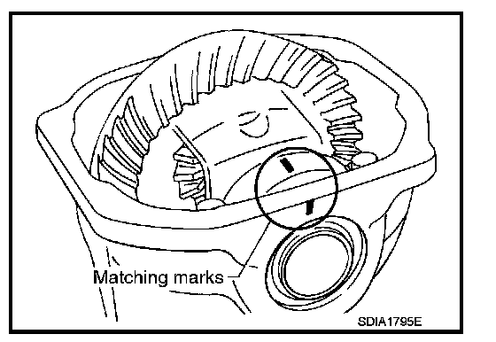7. Align the matching mark of differential case with the mark of drive gear, then place drive gear.