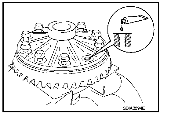 9. Install drive gear on the mounting bolts, and then tighten to the specified torque. Refer to "COMPONENTS".