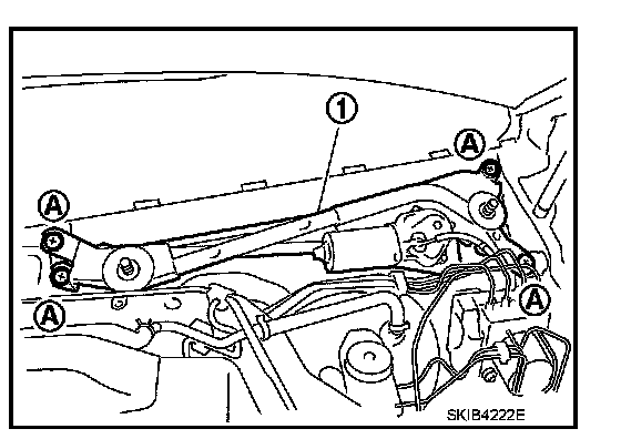 5. Remove front wiper drive assembly mounting bolts (A), and remove front wiper drive assembly (1) from the vehicle.