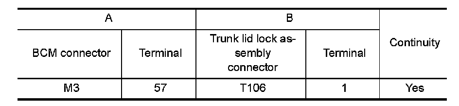 2. Check continuity between BCM connector and trunk lid lock assembly connector.