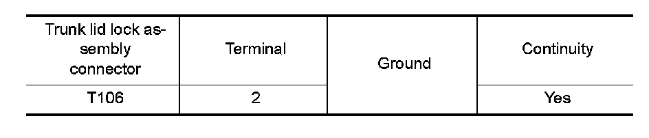 Check continuity between trunk lid lock assembly connector and ground.